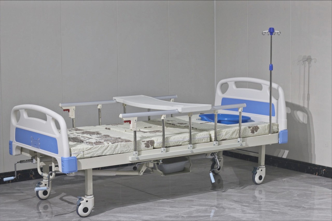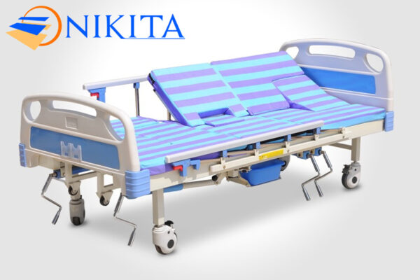 1- Chức năng bô vệ sinh tại giường: Giường với trang bị chức năng bô vệ sinh tại giường giúp người bệnh có thể đi vệ sinh ngay tại giường khi cần thiết mà không cần phải di chuyển vất vả vào nhà vệ sinh như trước đây. Chúng ta chỉ cần sử dụng chiếc tay quay được gắn với chức năng bô vệ sinh thì miếng nệm sẽ tự động tụt xuống và chiếc bô vệ sinh chờ sẵn ở dưới giá sẽ di chuyển vào đúng ngay lỗ bô đã định sẵn để người bệnh đi vệ sinh.