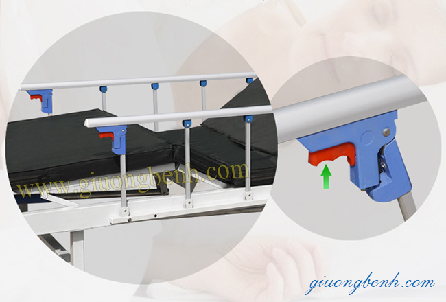 3- Thành giường có thể gập gọn 1 cách dễ dàng, Thanh chắn giúp bảo vệ người bệnh tránh bị rơi xuống đất. Ngoài ra, có thể gấp gọn đơn giản bằng cách ấn vào nút đỏ trên thành và gập lan can về phía trước. Thành giường còn có tác dụng để bàn an hoặc bàn làm việc laptop rất tiện lợi