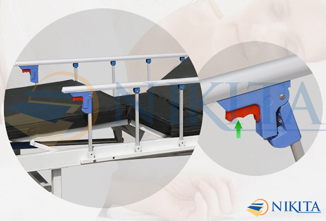 2 lan can giường 2 bên được làm từ chất liệu nhôm rất nhẹ nhàng, dễ giàng gập lên gập xuống khi cần cần thiết. Thanh chắn 2 bên giúp bảo vệ người bệnh tránh bị rơi xuống đất. Ngoài ra, có thể gấp gọn đơn giản bằng cách ấn vào nút đỏ trên thành và gập lan can về phía trước.
